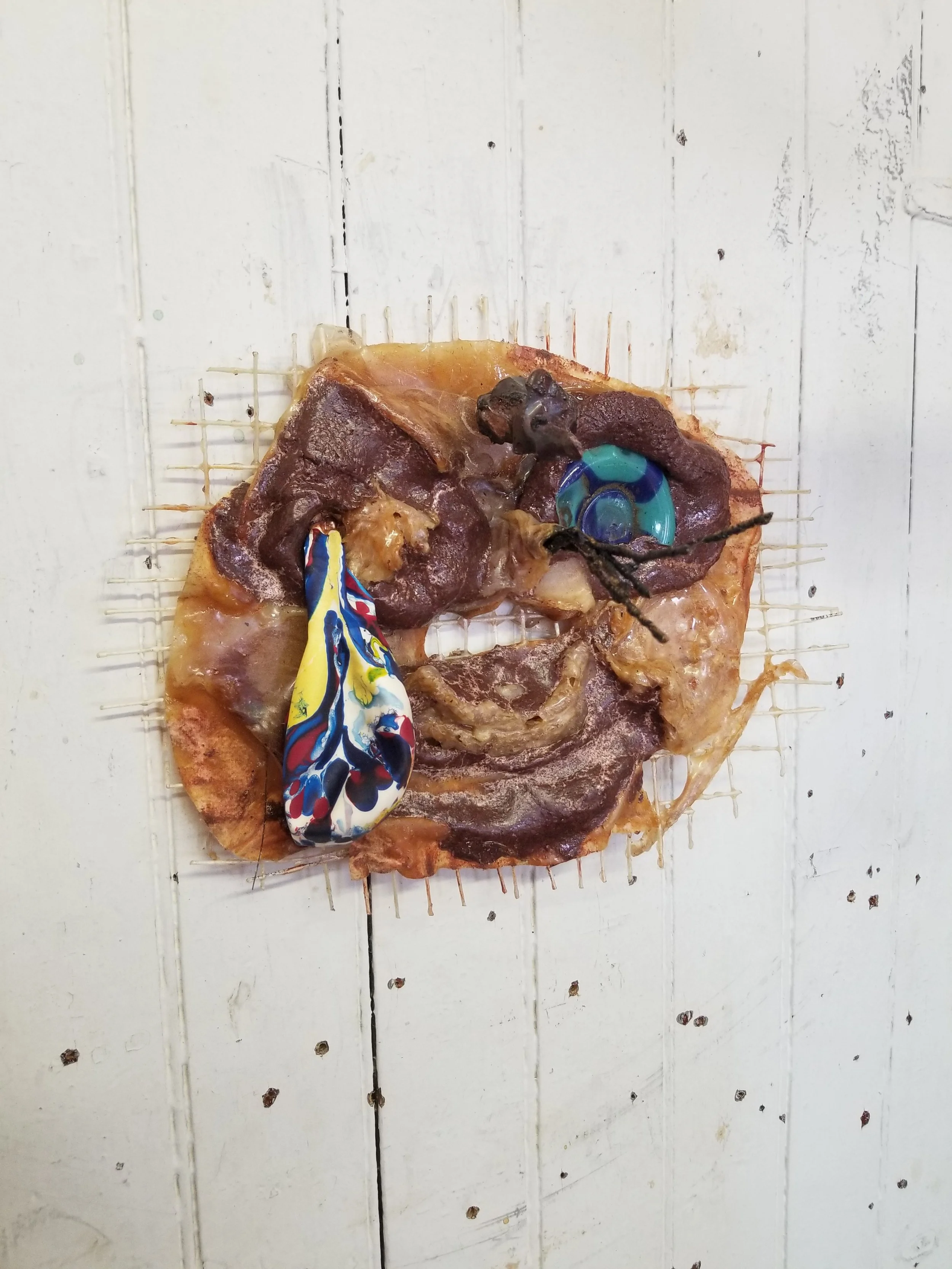 Acrylic polymer emulsion, alligator claw key chains, ceramic, debris, epoxy, fabric scraps, glitter, pigment, silicone, silver, synthetic flocking powder, tennis ball, thread, variegated leaf